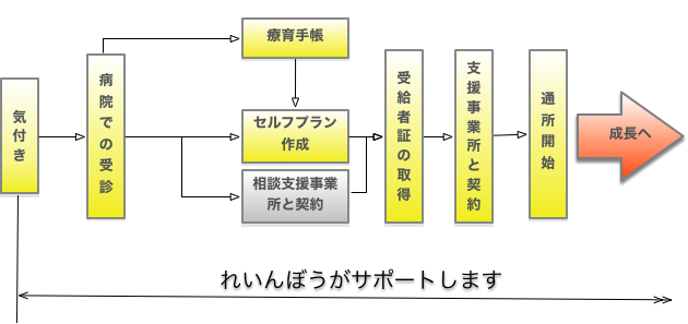 お子さまの発達に不安を感じてから、児童発達支援所に通所するまでは下記のようなフローになります。れいんぼうでは、「気づき」の時点から事業所通所、さらに卒所後についても親御さんとつながりを大切にし、サポートしていきます。